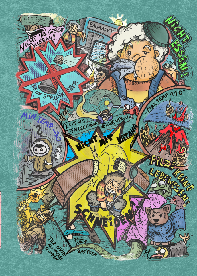 This image humorously illustrates what can go wrong when working with felt. Exaggerations like cutting with a chainsaw or using it as a parachute make it clear that felt should only be used correctly. Fun, but educational!