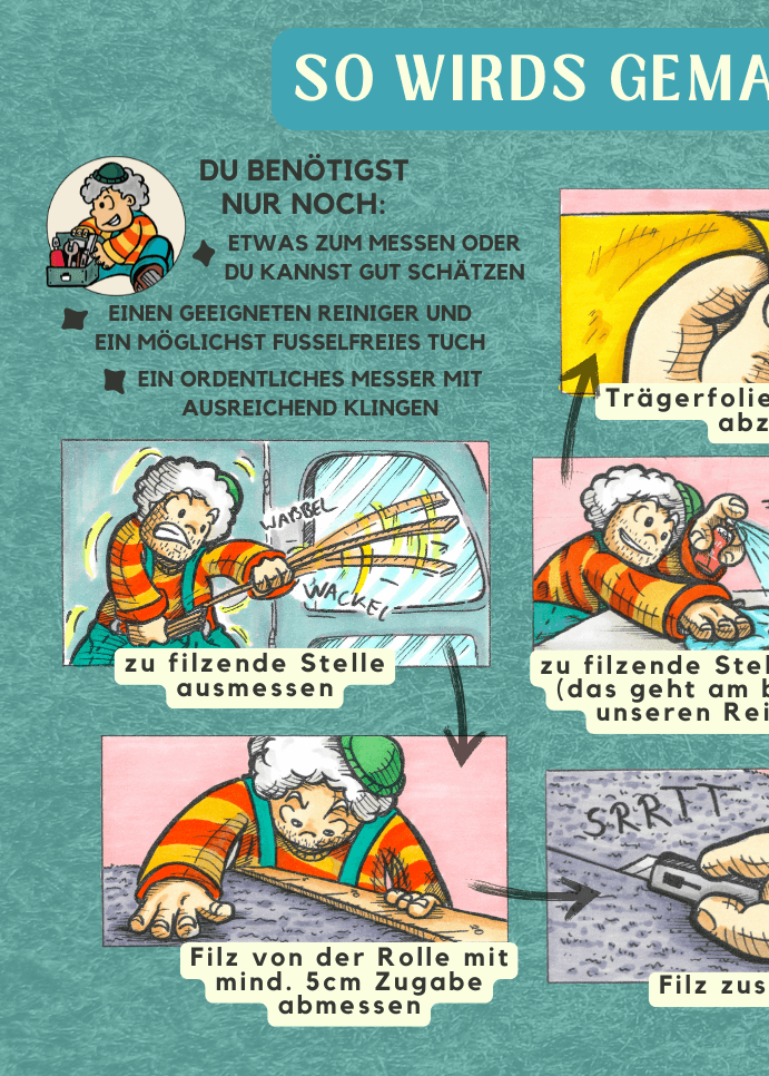 Avant de commencer à coller, nettoyez soigneusement la zone à feutrer, de préférence avec un nettoyant approprié de notre boutique. Retirez ensuite uniformément le film de support du feutre et veillez à bien positionner le feutre. Découpez le feutre avec au moins 5 cm de surplus pour vous assurer que tout s'adapte parfaitement. Étalez le feutre uniformément lors de l'application et retirez le film progressivement. Enfin, vous pouvez monter les plaques recouvertes et admirer le résultat – c'est prêt !